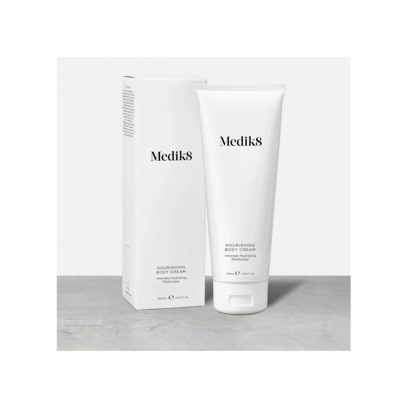Nourishing Body Cream Medik8 es una crema corporal ultrahidratante formulada para restaurar la suavidad, la elasticidad y el confort de la piel seca y deshidratada. Enriquecida con glicerina natural, manteca de cacao y la tecnología Moisture Magnets™, ayuda a retener el agua y fortalecer la barrera cutánea durante todo el día. Su textura nutritiva, pero de rápida absorción deja la piel flexible, sedosa y visiblemente más saludable.